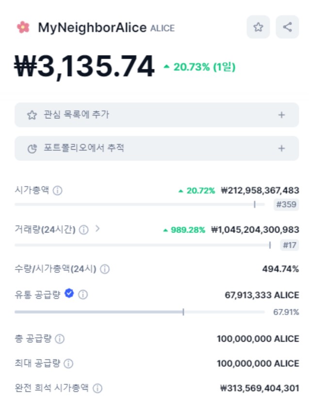 마이네이버앨리스(ALICE) 코인의 시장 유통량은 전체 발행량의 494.74%에 해당하며, 시가총액은 ₩ 313,569,404,301 원입니다.